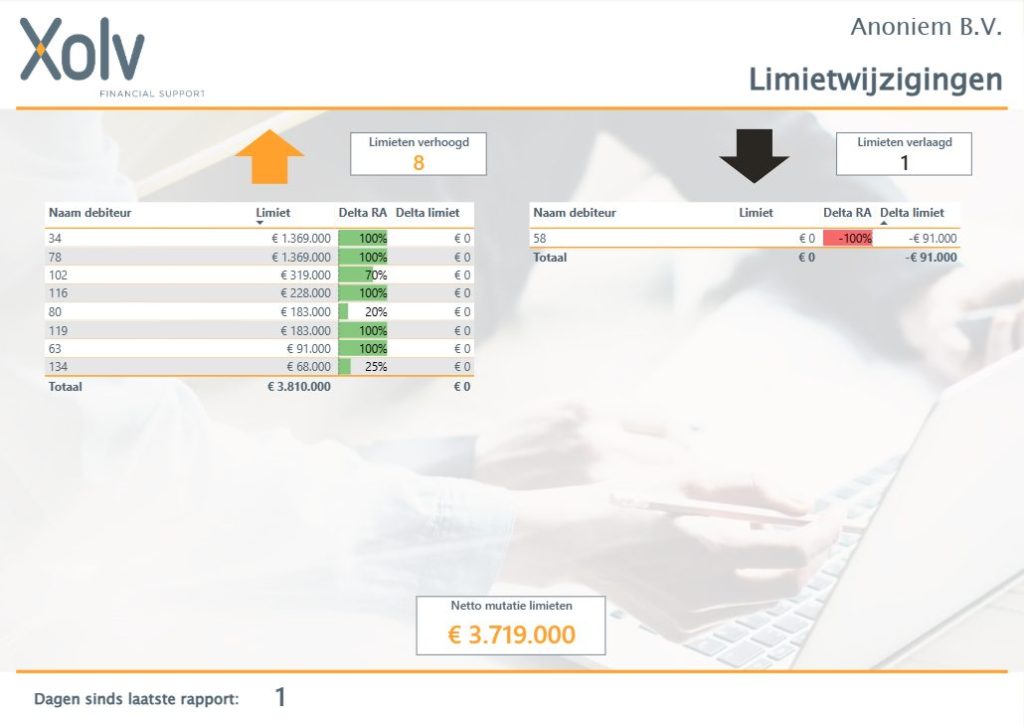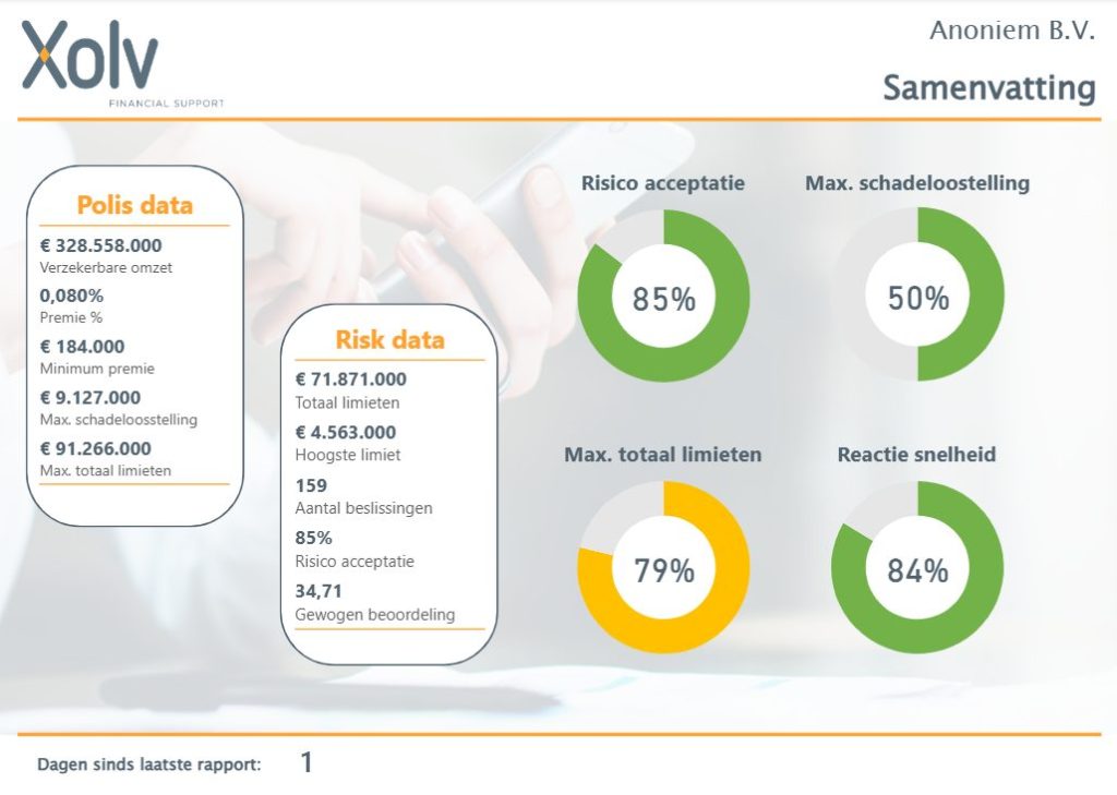The report brings together all the essential elements that determine whether a policy is still functioning optimally. It provides clarity about the current acceptance of the total portfolio and shows whether there is still room to request new limits. It also clarifies how much margin is still available within the maximum compensation and how risky the portfolio is on average. This complete picture immediately reveals where any bottlenecks lie and where opportunities arise.
